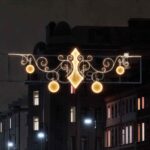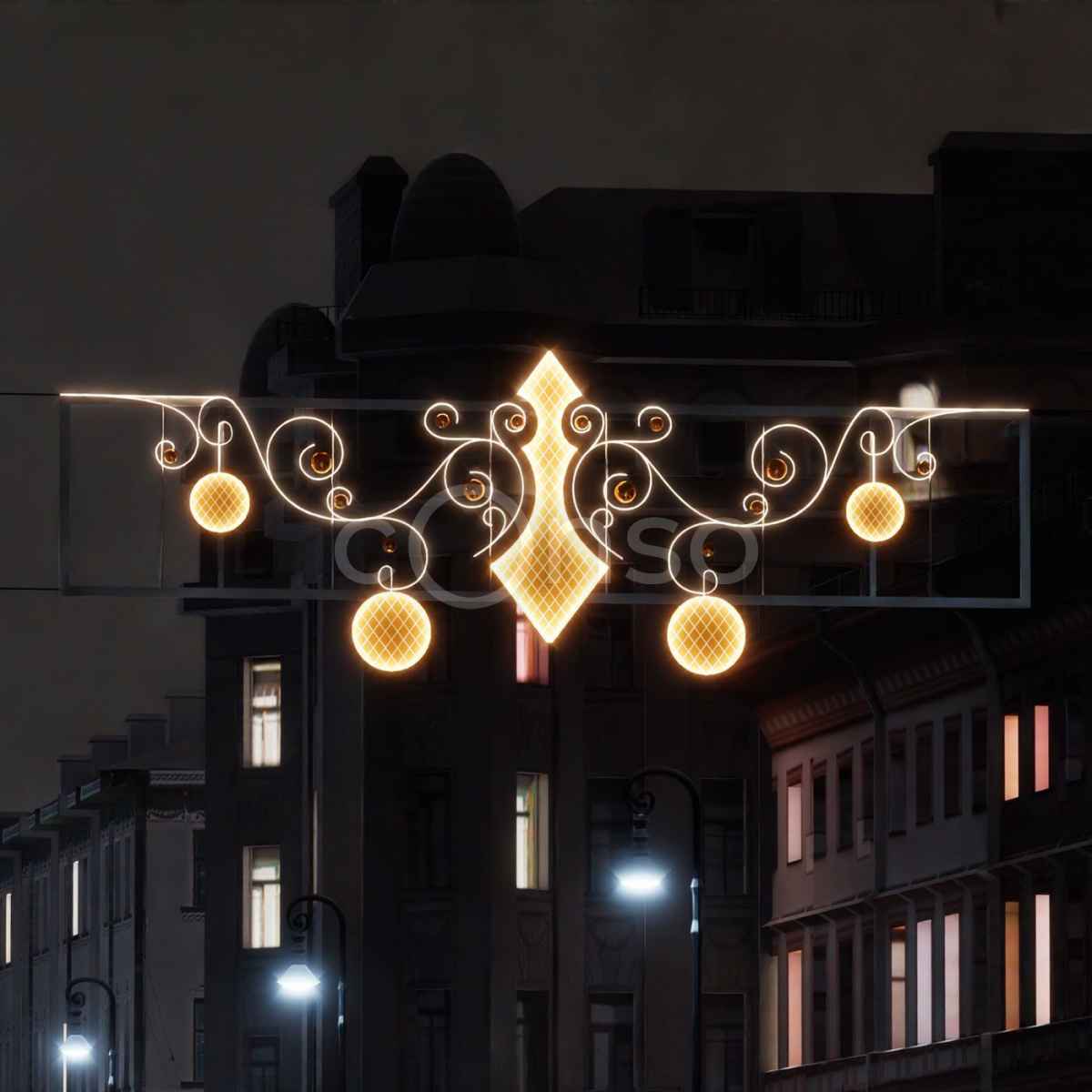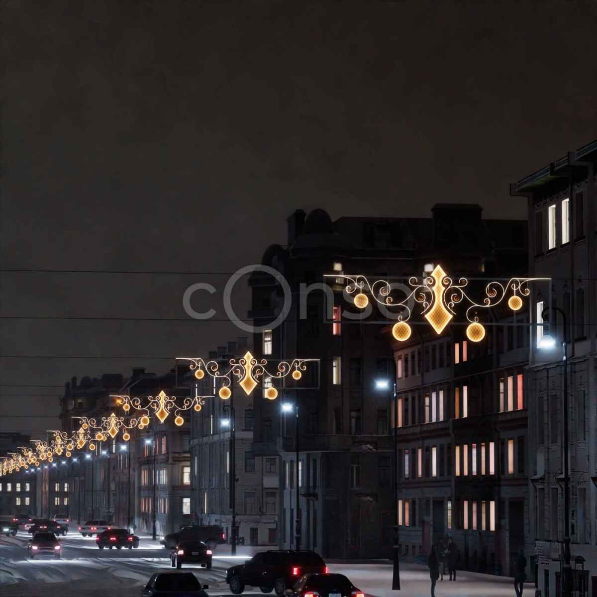Перетяжка на Новый год для улицы легко интегрируется в общую концепцию оформления, создавая завершённый и праздничный образ. Благодаря модульной конструкции её можно использовать в комплексе с арками, световыми деревьями и гирляндами.