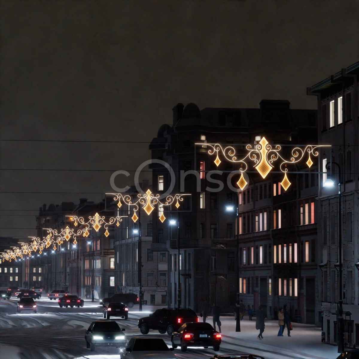 Световая перетяжка на Новый год — это декоративный элемент, который задаёт настроение праздника и наполняет улицы особым сиянием. Установленная над проезжей частью или в пешеходной зоне, она привлекает внимание, формирует атмосферу уюта и подчеркивает торжественный характер события.