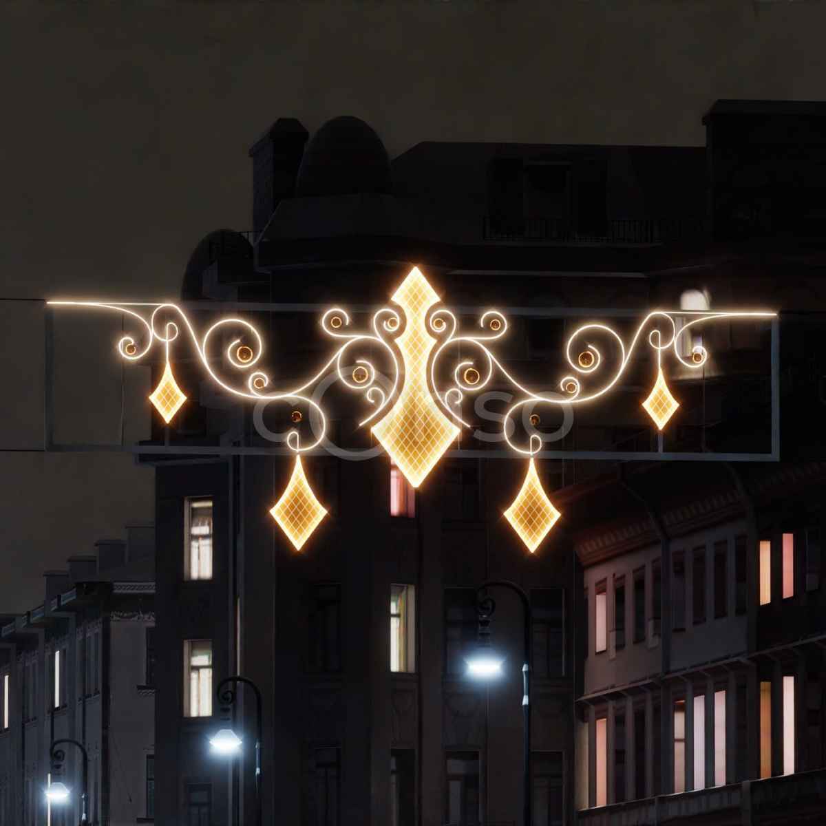 Световая перетяжка на Новый год от JOYLED — стильное решение для оформления улиц, площадей и фасадов. Каркас из окрашенного алюминия, защита IP65 и рабочий ресурс до 50 000 часов гарантируют надёжность в любых погодных условиях. Размер 4×1,5 м делает фигуру универсальной для городских пространств. Тёплое золотое свечение создаёт атмосферу праздника и уюта.