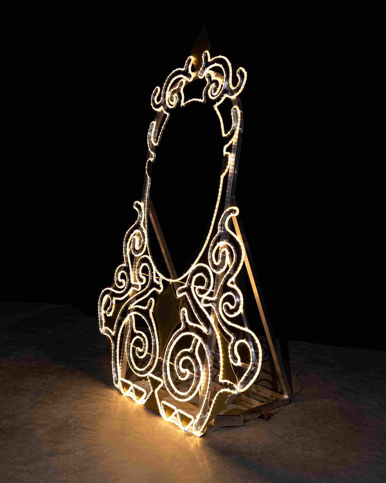 Световая фотозона «Зеркало» — это современный арт-объект, созданный JOYLED для тех, кто ценит атмосферу праздника и яркие эмоции. В её основе — эффектный дизайн с акцентом на золотое сияние, которое ассоциируется с роскошью, теплом и благополучием. Фигура станет центром притяжения в любом пространстве: от городской площади до парка или торгового центра.