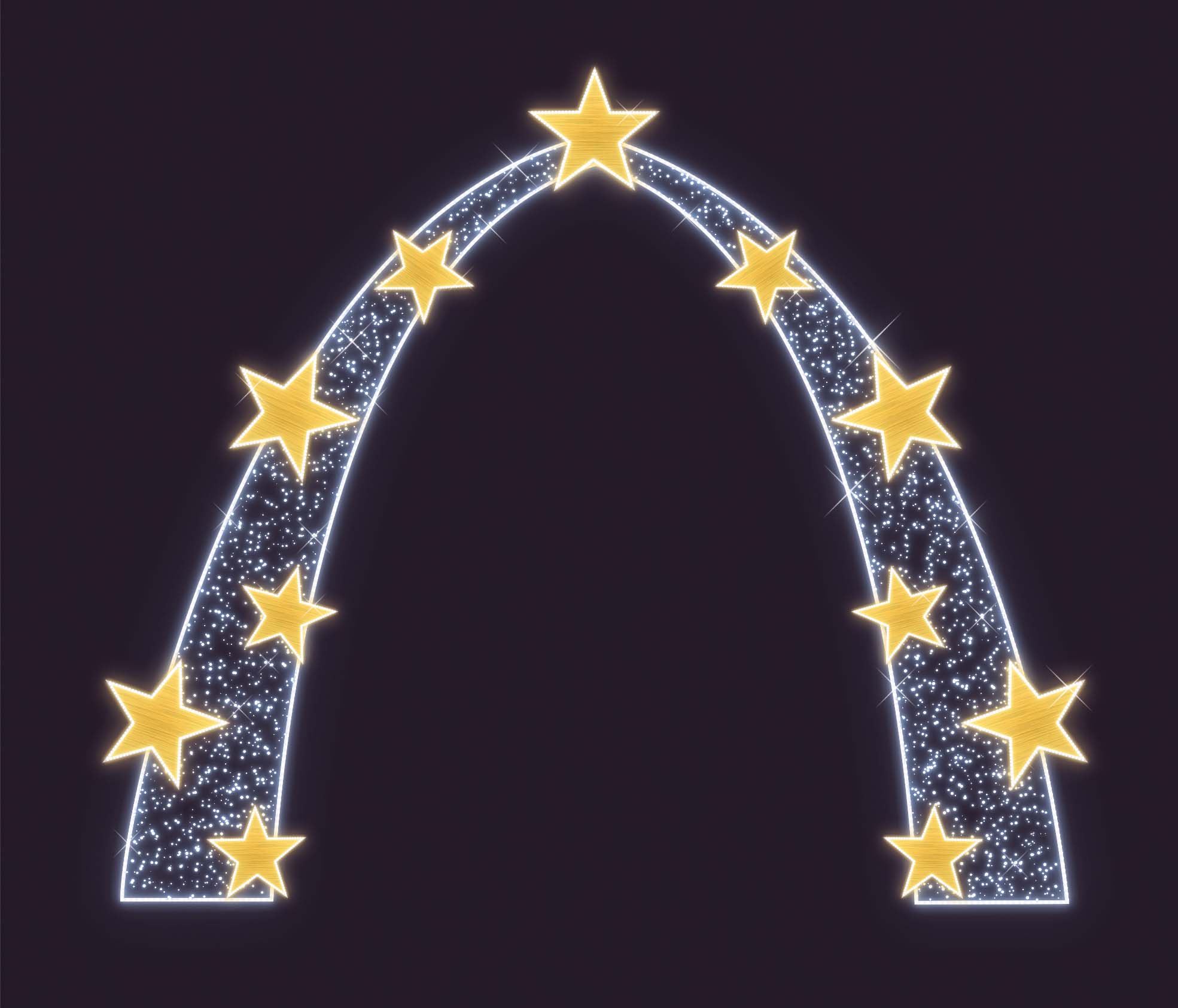 Холодное свечение передает ощущение торжественности и официальности, идеально подходит для государственных праздников, деловых мероприятий и зимних торжеств. Яркий белый свет делает арку видной издалека и создает эффектный контраст с окружающим пространством.