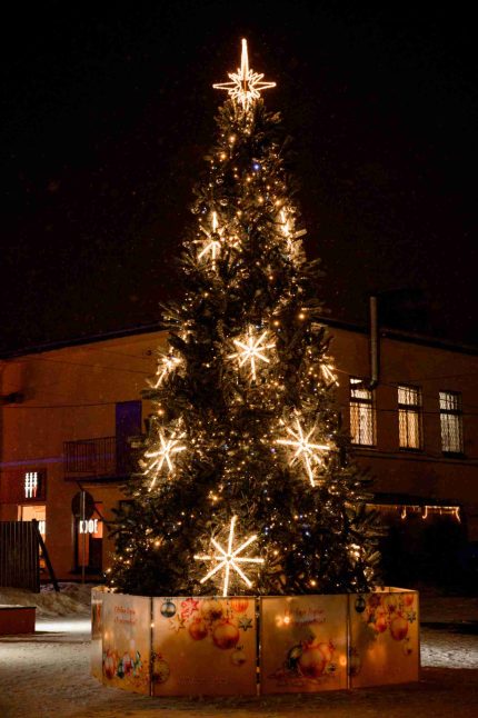 С габаритами 7×18 метров, эта ёлка моментально становится центром композиции — днём она подчёркивает масштаб объекта, а вечером превращается в сияющий арт-объект с тёплой праздничной атмосферой.