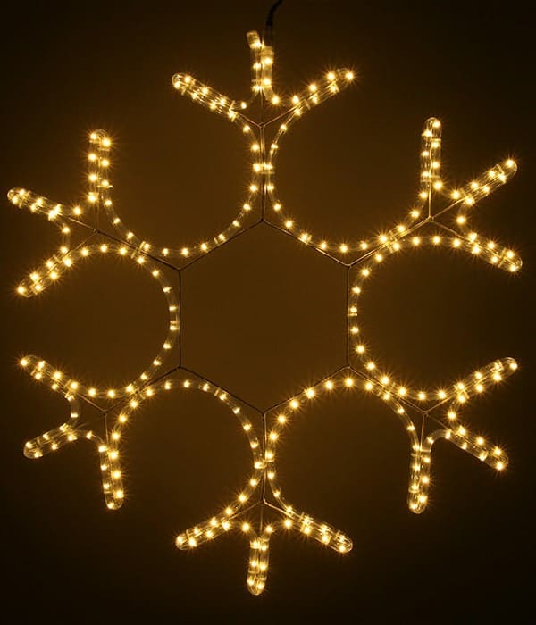 Светодиодный шнур залит в гибкую оболочку — он равномерно подсвечивает каждый «луч» снежинки. Свет плотный, без тёмных зон, хорошо читается на расстоянии.