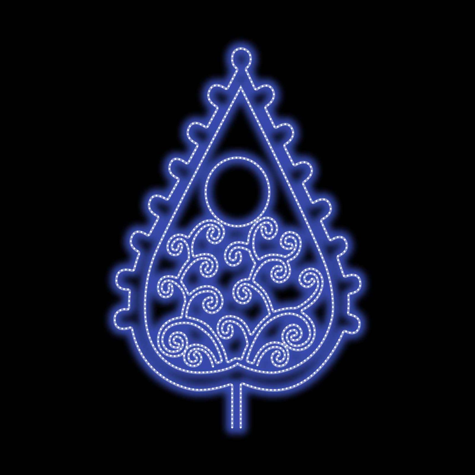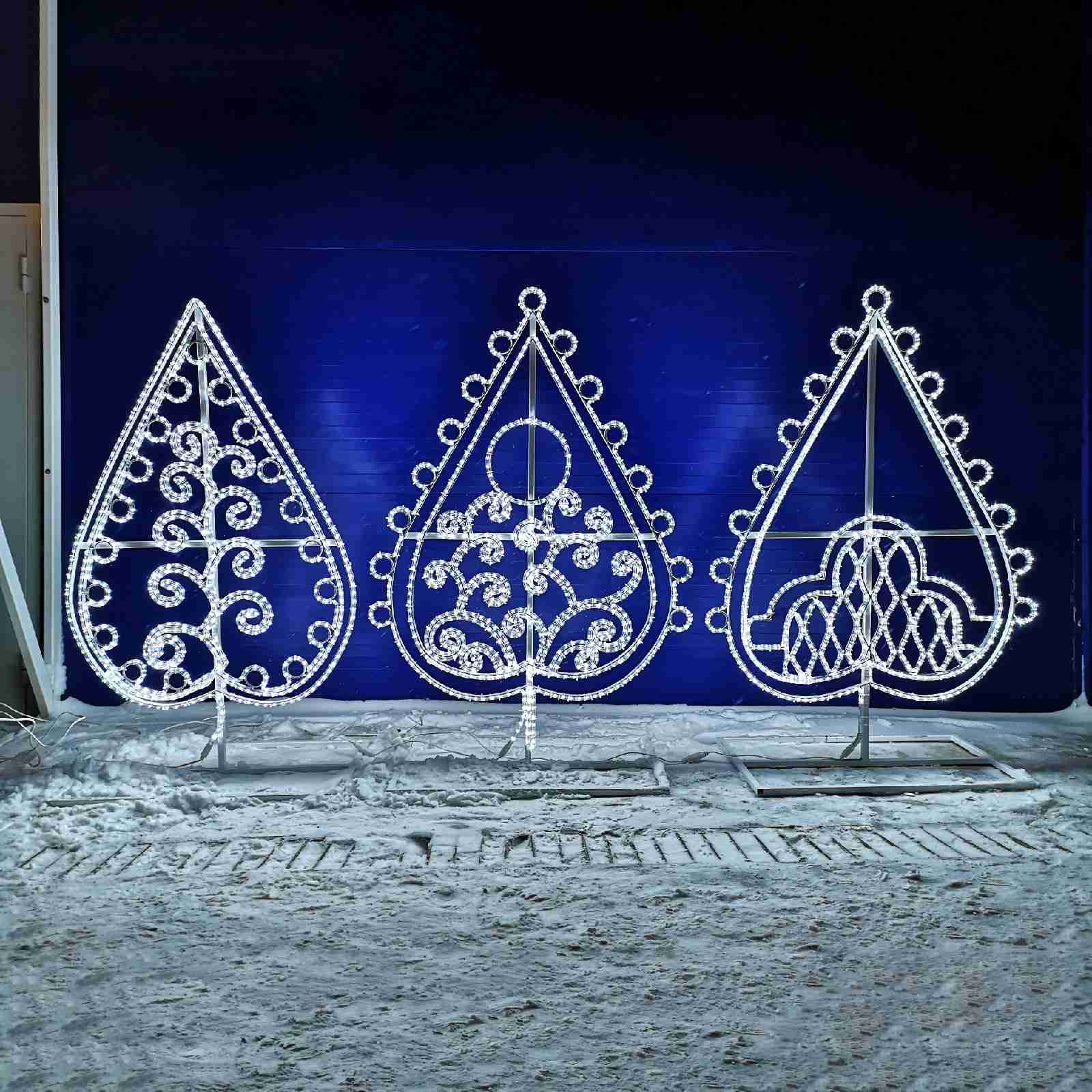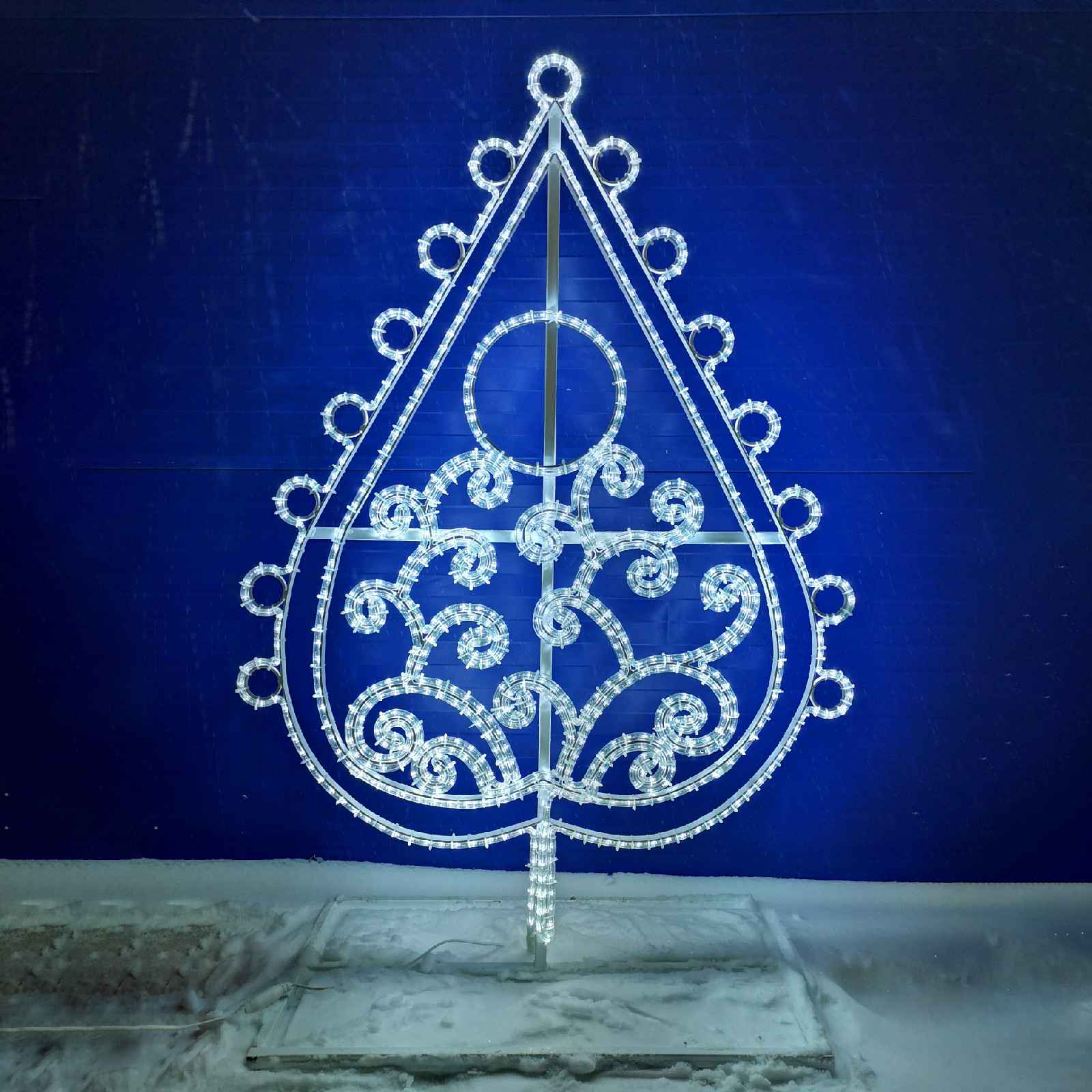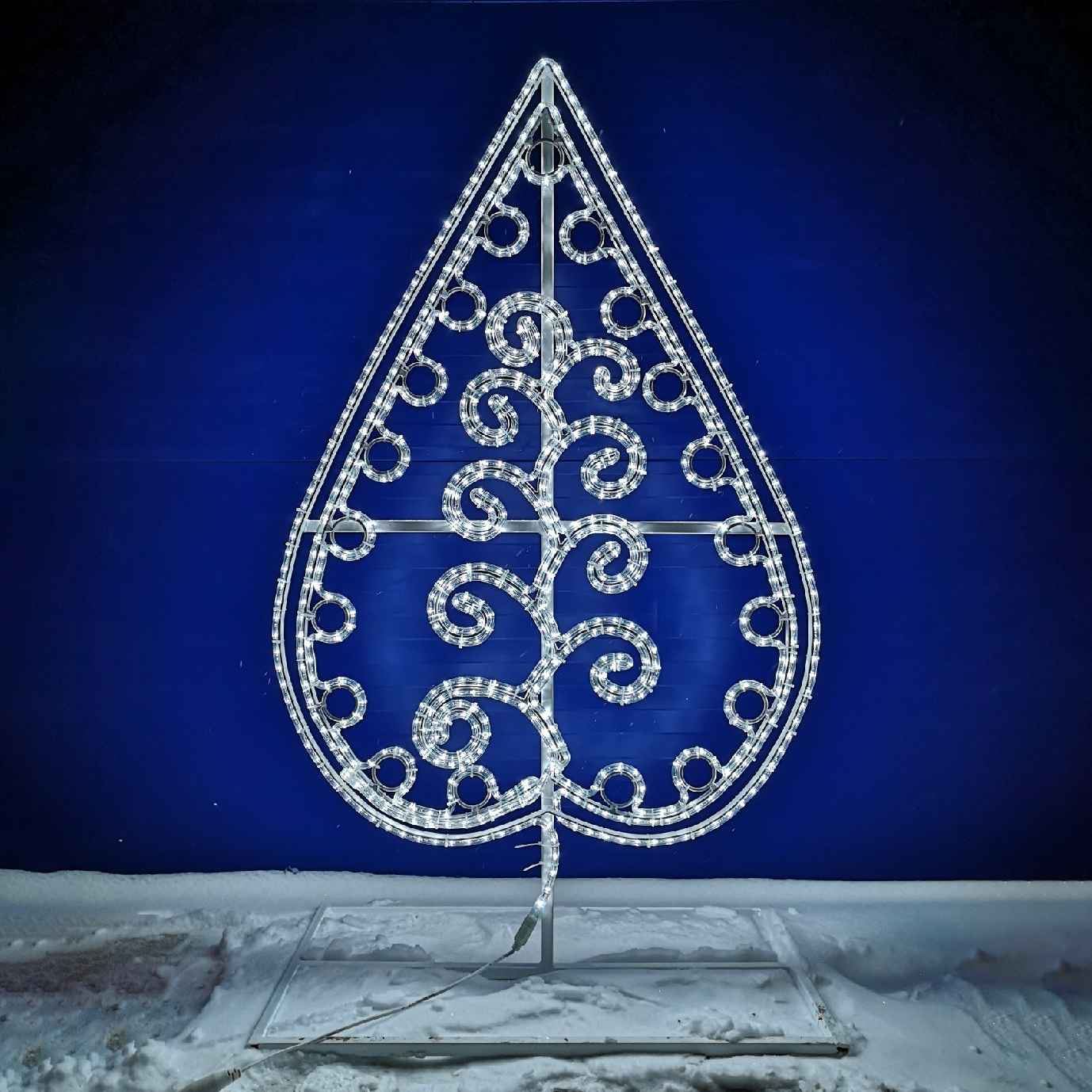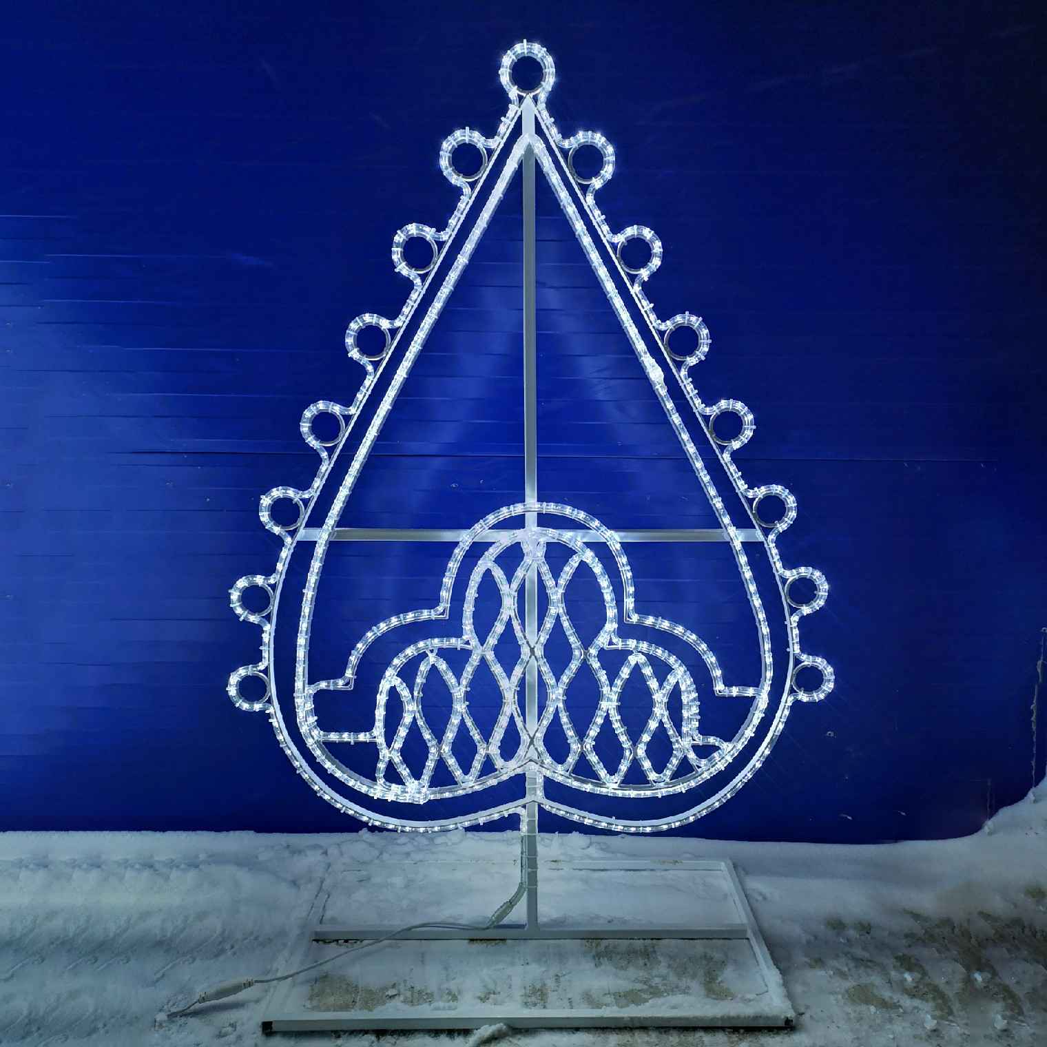 Фигура доступна в пяти вариантах высоты: 1,3 м, 1,5 м, 1,8 м, 2 м и 2,2 м. Это позволяет легко подобрать решение под конкретный объект: небольшое дерево — для домашнего участка, высокое — для городской площади или торгового центра. Светодиоды установлены равномерно по всей конструкции, обеспечивая мягкое, но заметное свечение.