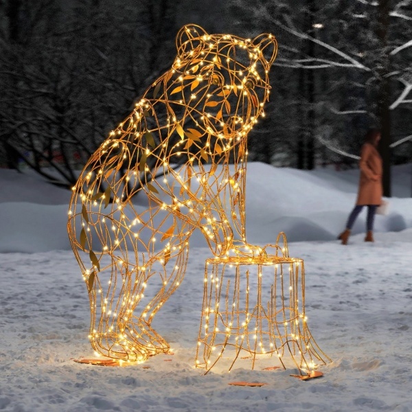 Премиальная световая фигура медведя высотой 1,7 метра с выбором золотистого или серебряного свечения. Алюминиевый каркас обеспечивает лёгкость и прочность конструкции. Морозостойкость до -50°C позволяет круглогодичное использование. Степень защиты IP65 гарантирует надёжную работу в любую погоду. JOYLED предлагает полный спектр услуг от производства элитных световых фигур до профессионального монтажа и обслуживания.