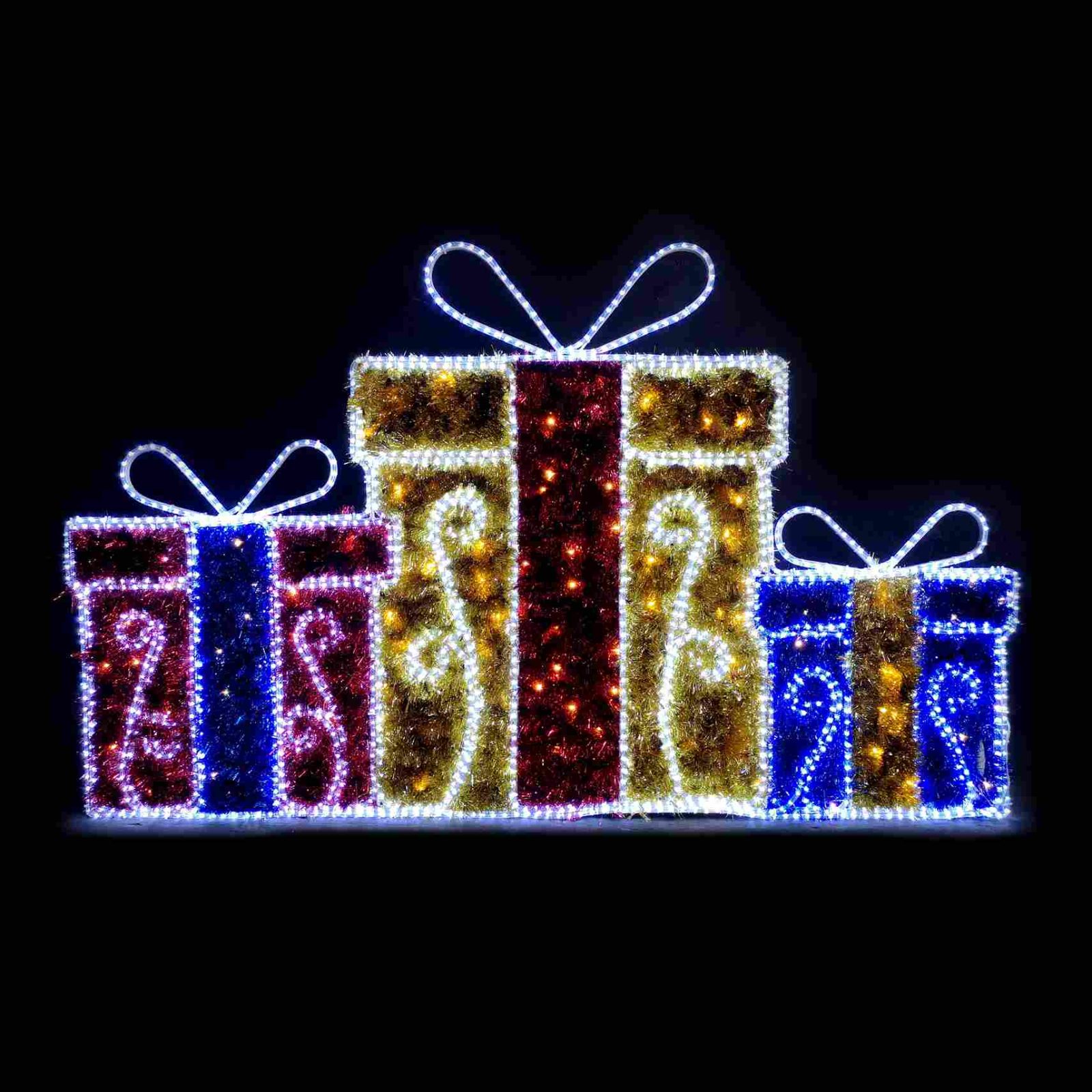 Световая фигура «Подарки» — это узнаваемый и универсальный элемент новогоднего оформления, который легко вписывается в любой сценарий: от городских улиц до частных дворов. Благодаря плоскому каркасному исполнению и яркой светодиодной заливке, фигура хорошо читается как днём, так и вечером, создавая эффект уюта, заботы и праздничного настроения.