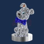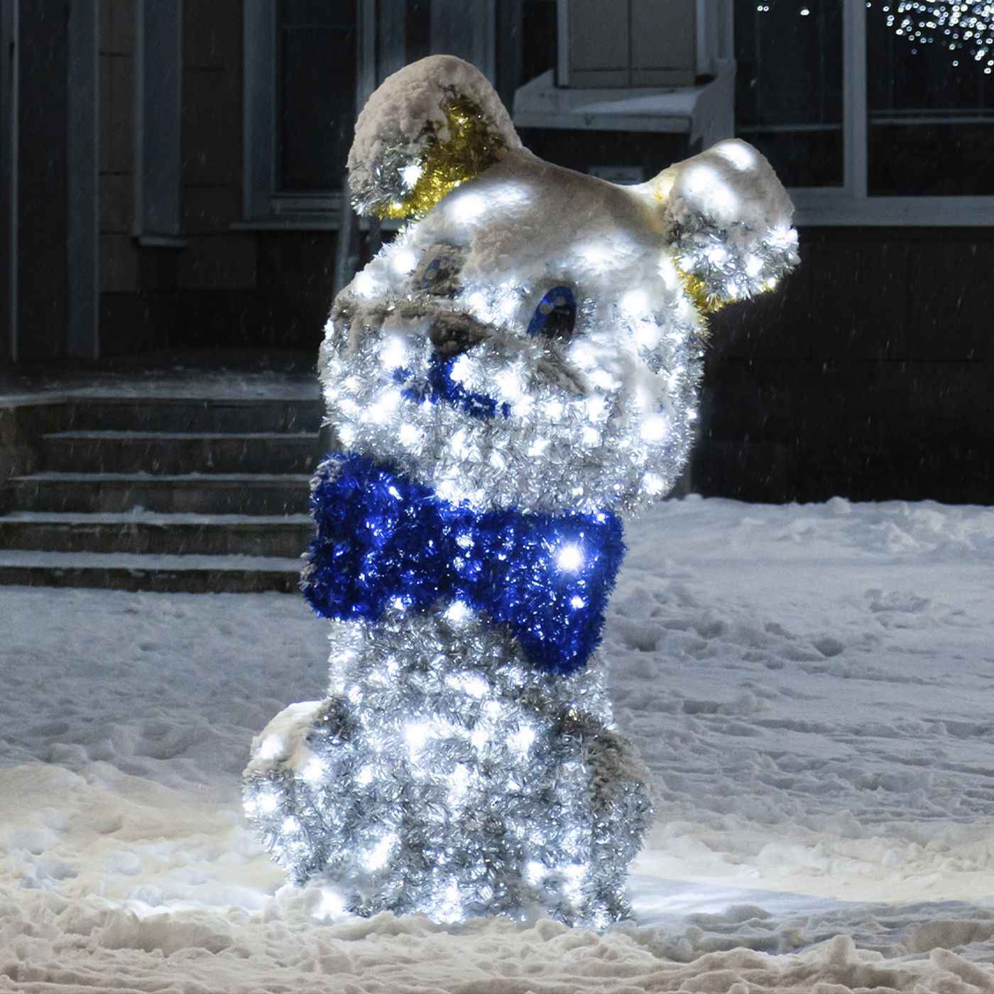 Объёмная световая фигура в виде щенка — тёплый и запоминающийся акцент в праздничном оформлении. Мишурное покрытие, холодное свечение, IP65. Подходит для ТЦ, улиц и парков. Высота — 2,3 м. Прочная алюминиевая конструкция. Поставляется с подключением и готова к установке на объекте.