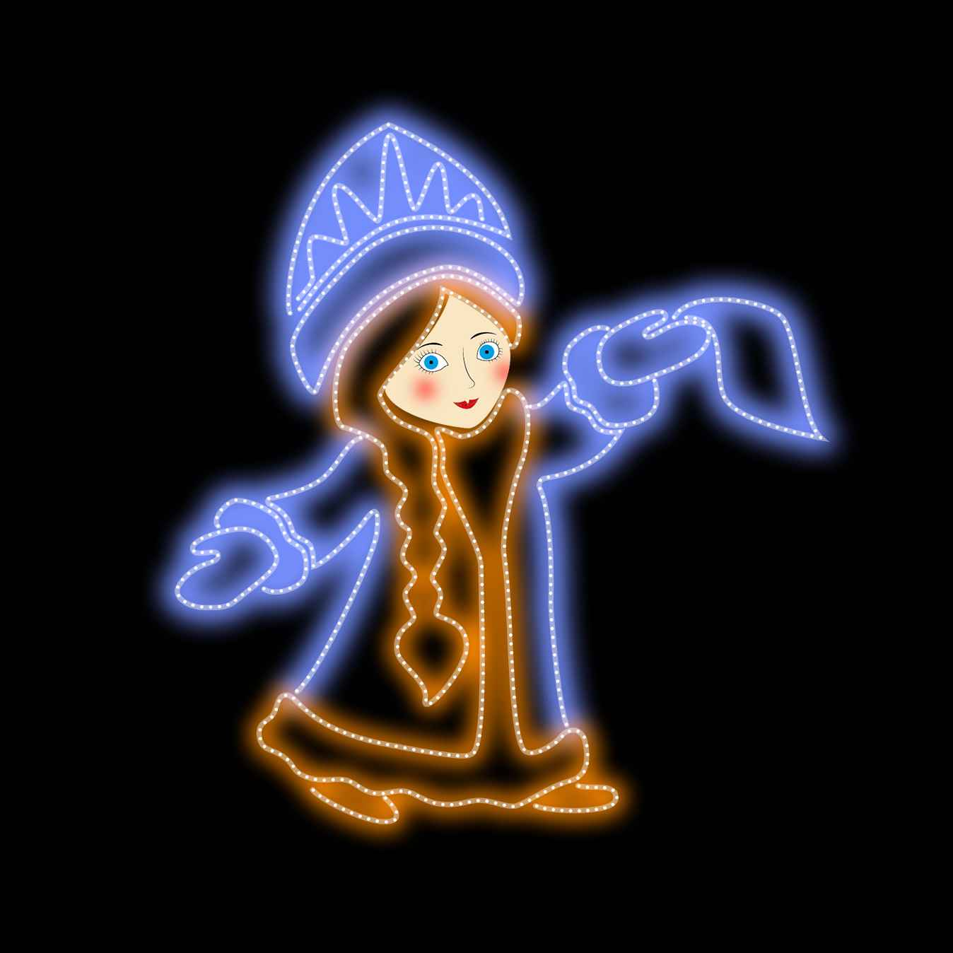 Световая фигура «Снегурочка» — это воплощение зимней сказки в современном уличном оформлении. Узнаваемый образ, чёткие линии каркаса и мягкое свечение делают эту фигуру настоящим центром притяжения для детей и взрослых. Высота изделия варьируется от 1,4 до 1,9 метра, благодаря чему оно уместно смотрится как на городской площади, так и у входа в торговый центр или в сквере у дома культуры.