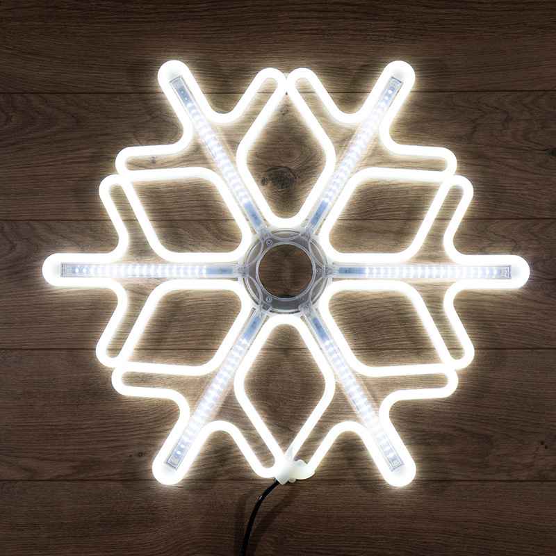 Уличная световая фигура «Снежинка» из гибкого неона с белым свечением и эффектом «тающей сосульки». Подходит для фасадов, витрин, городских площадей, парков и входных групп. Полная пылевлагозащита IP65, монтаж под ключ. Работает при температуре от -25 до +40 °С.