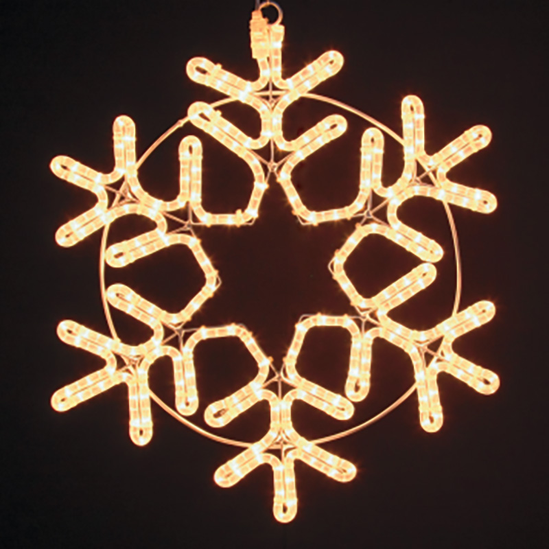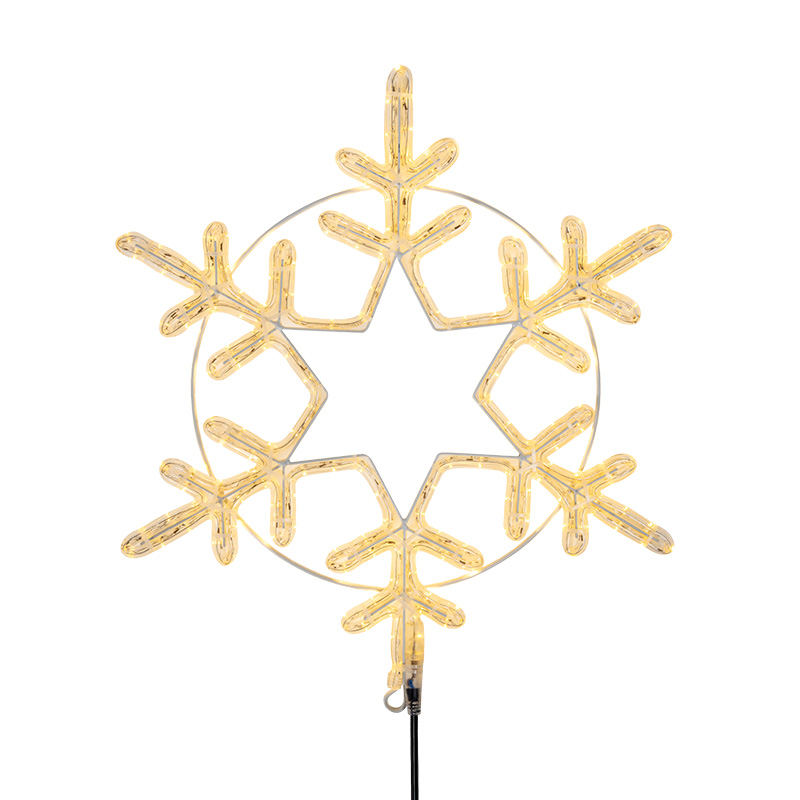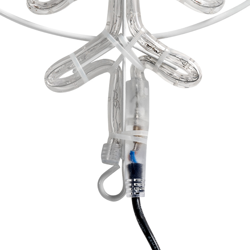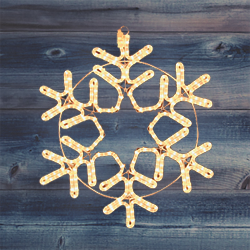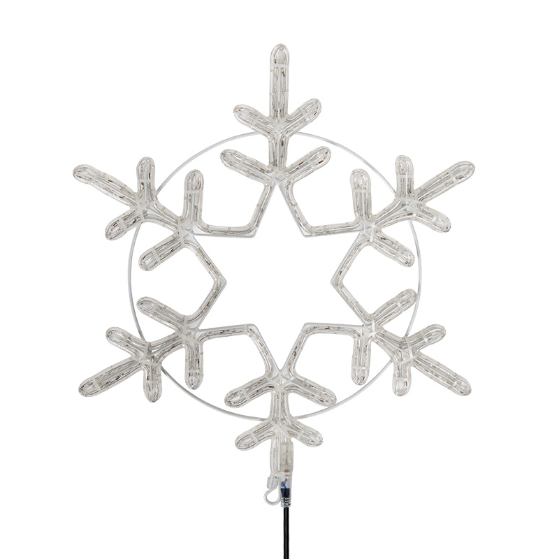 Фигура изготовлена из дюралайтового шнура, залитого в прозрачную защитную оболочку. Он устойчив к влаге, ультрафиолету и температурным перепадам. Каркас внутри обеспечивает точную геометрию снежинки.