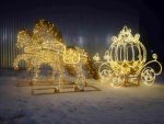 Карета с лошадьми гармонично сочетается с арками, световыми деревьями, надписями и другими фигурами, образуя цельные праздничные композиции.