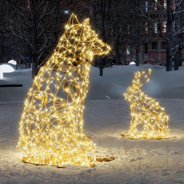 Светодиодная композиция из двух фигур: лисы и зайца. Объёмные каркасные конструкции, покрытие — окрашенный алюминий, свечение — золотое. Высота фигур: 1,45 м и 0,9 м. Устойчивы, безопасны, подходят для улиц, парков, входных групп и фотозон.