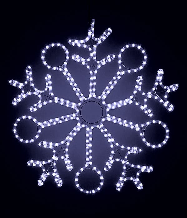 Снежинка равномерно светится по всей площади. Применённый дюралайт создаёт мягкое свечение без засветов и провалов — фигура выглядит аккуратно и законченно даже при ближнем рассмотрении.