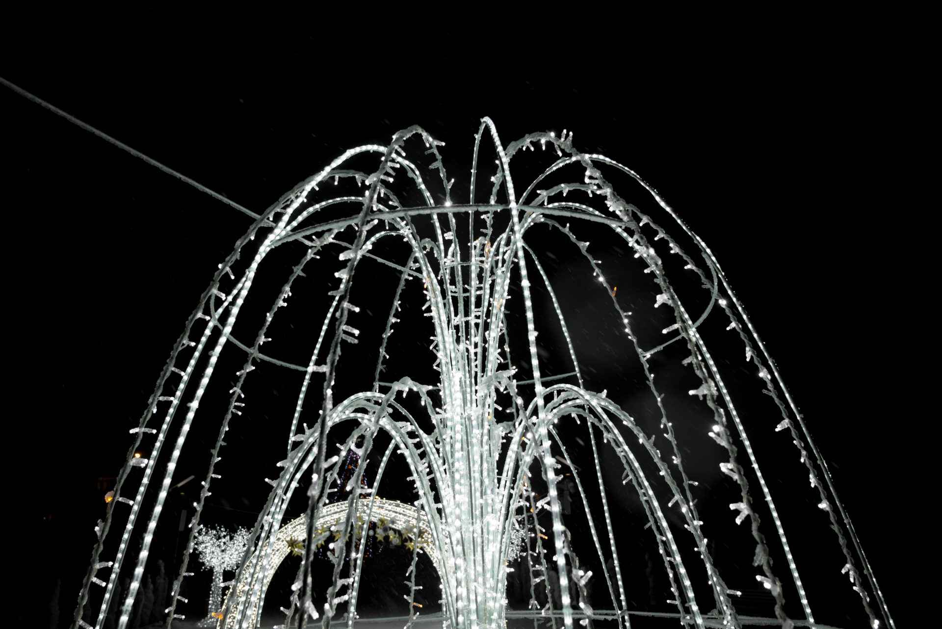 Такое оформление уместно как на центральной площади города, так и у входа в торговый центр или бизнес-здание. Световой фонтан подчёркивает статус объекта, привлекает внимание и создаёт впечатление масштабного, хорошо организованного праздника.