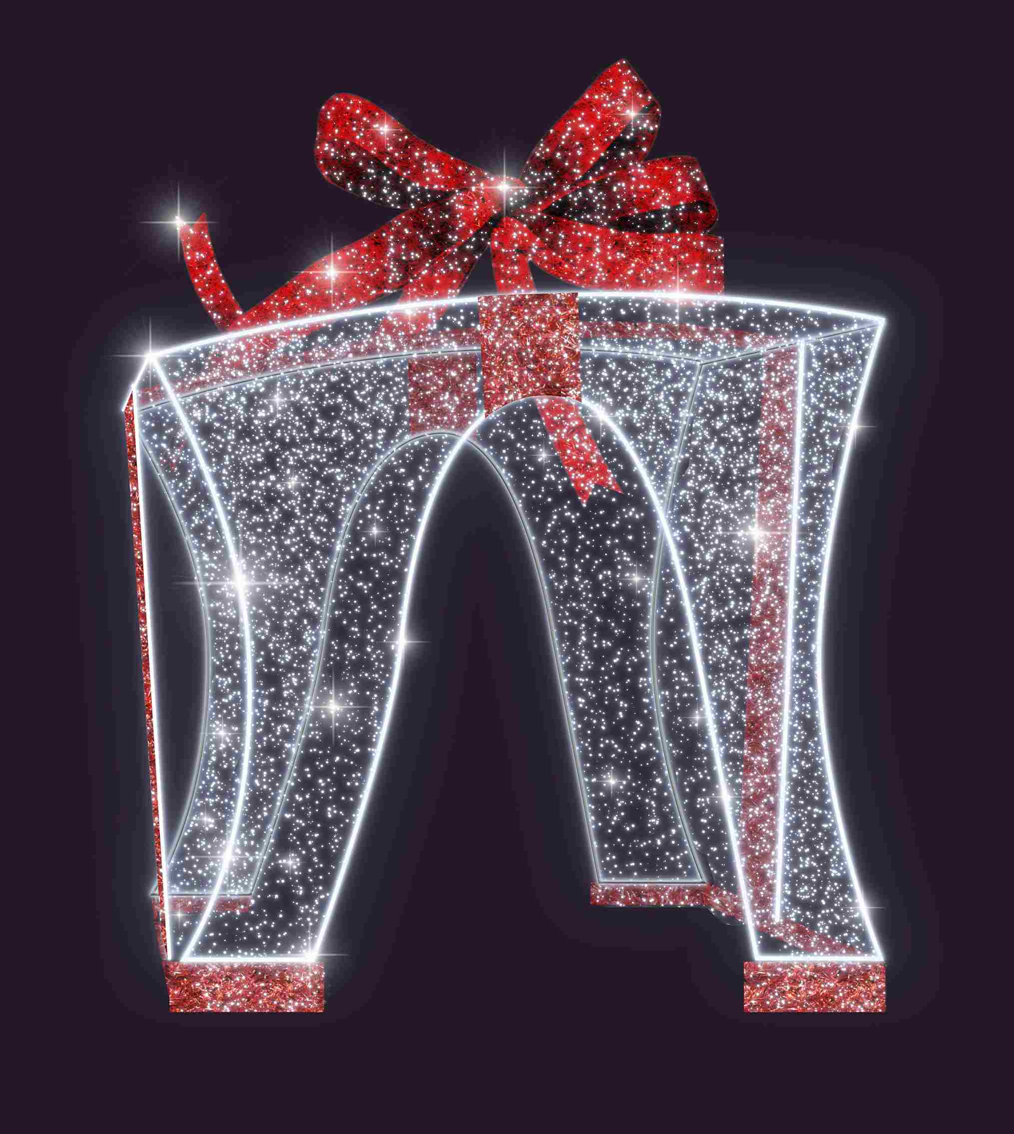 Световая фигура «Подарок» СК-181 — это объёмная уличная конструкция, которая сразу привлекает внимание благодаря своим размерам (4 × 4,5 м) и яркому красно-серебряному свечению. Такой объект идеально подходит для новогоднего оформления центральных улиц, площадей, торговых и бизнес-центров, парков и общественных пространств.