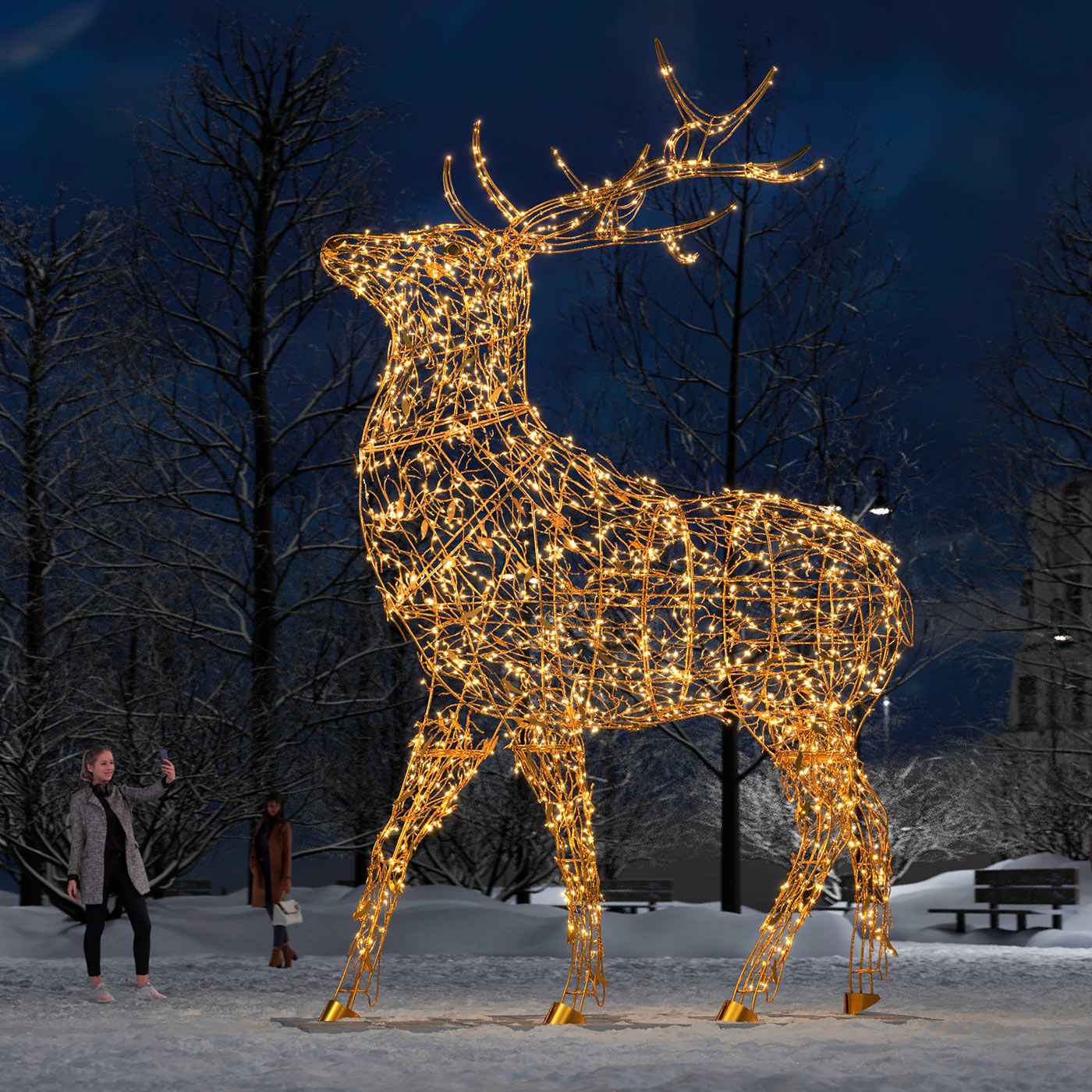 Праздничный уличный арт-объект — рождественский олень высотой 5 метров. Каркас из окрашенного алюминия, эффектное свечение в золотом или серебряном цвете, защита IP65, питание от сети 24 В. Надёжная конструкция для улицы и масштабных новогодних инсталляций. Монтаж под ключ от JOYLED.