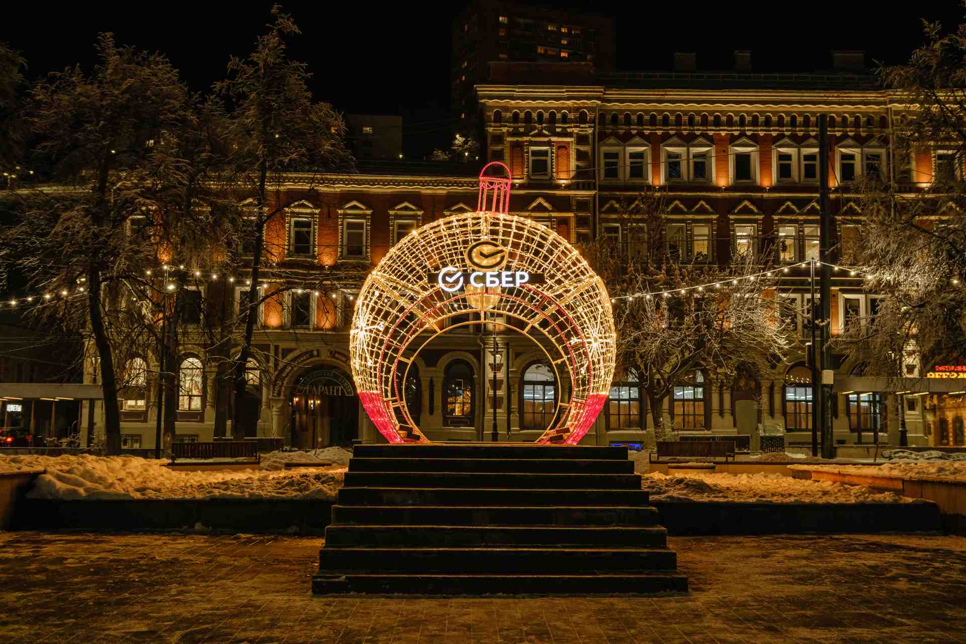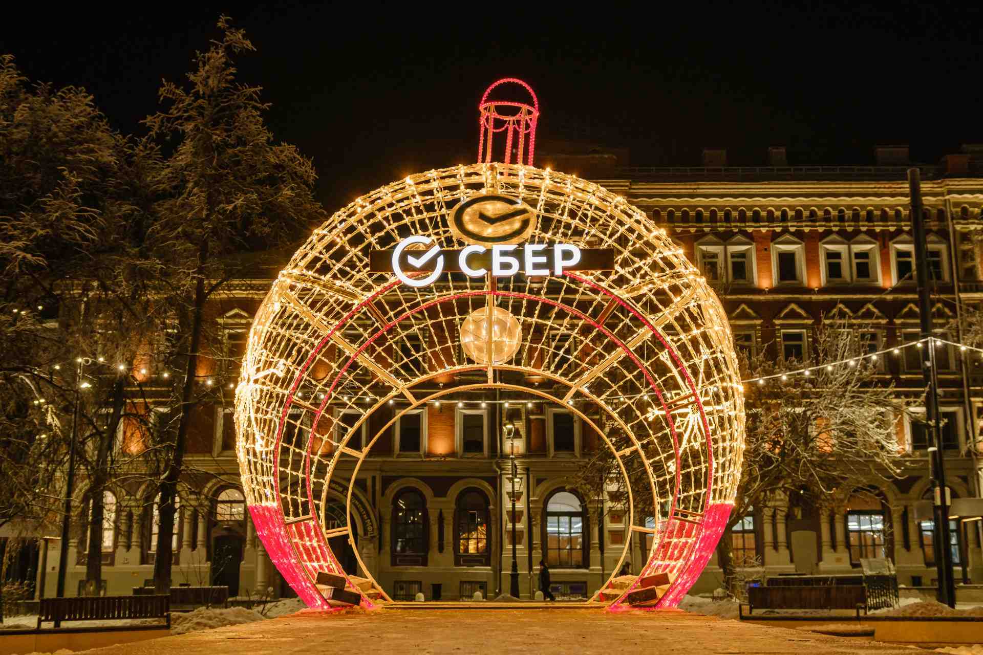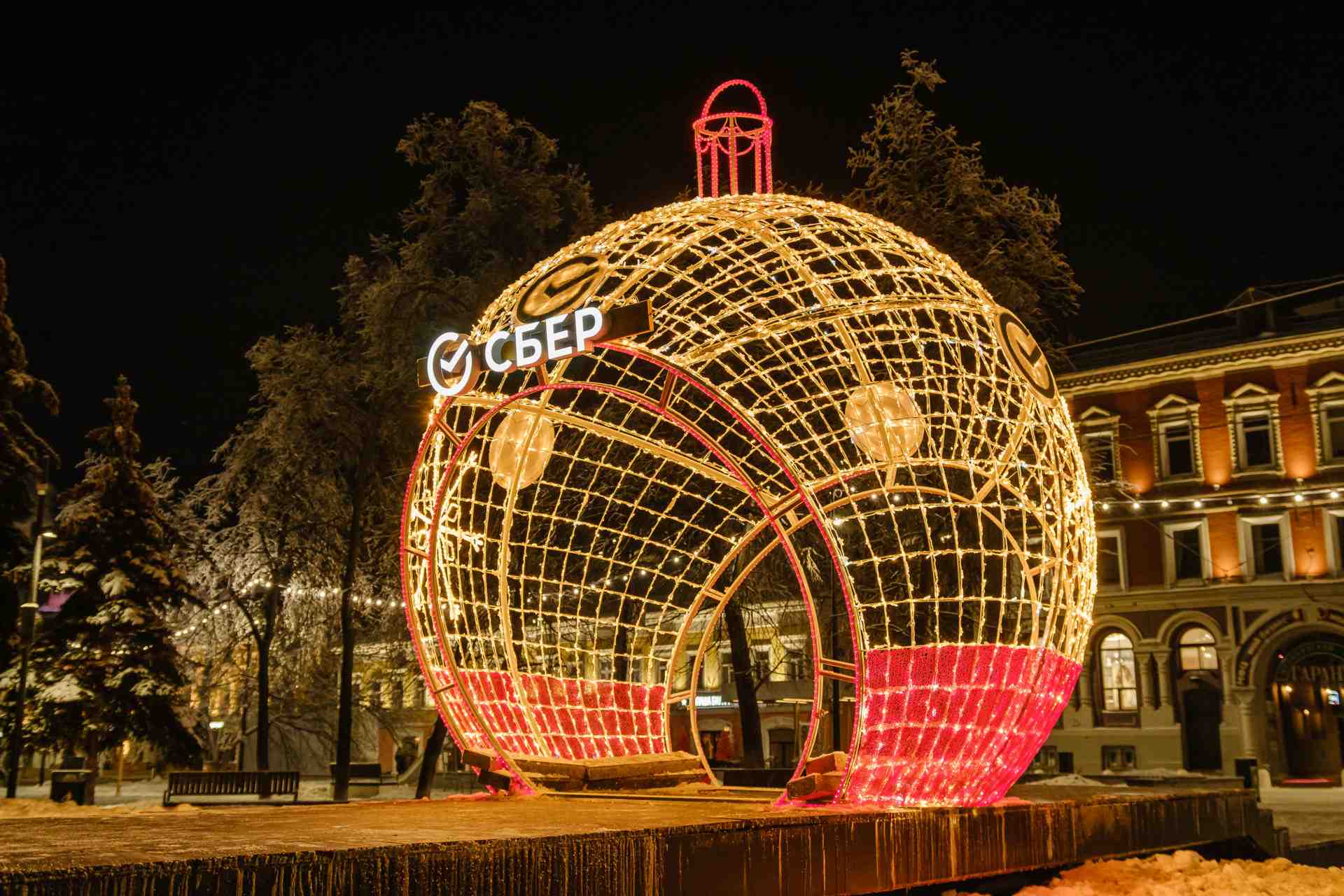 Объёмный световой шар высотой 4,3 м — эффектный акцент для городской площади, торгового центра или фотозоны в парке. Красное и золотое свечение создаёт атмосферу праздника и уюта. Конструкция устойчива к морозам, снегу и дождю. Шар можно использовать как самостоятельный арт-объект или часть инсталляции. Надёжная сборка и монтаж под ключ от JOYLED.