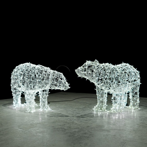 Световая композиция из фигур медведя и медведицы ― яркий акцент для зимнего оформления парков, площадей, торговых центров и городских улиц. Прочные каркасные конструкции из оцинкованной стали с покраской, холодное белое свечение, круглогодичная эксплуатация при температуре от -50 до +40 °С.