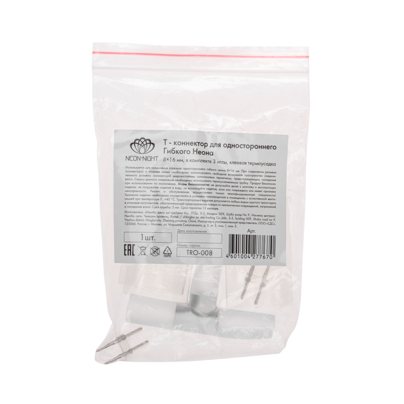 Соединитель изготовлен из термостойкого прозрачного пластика, устойчивого к нагреву, вибрациям и механическим нагрузкам. Элементы контактной группы плотно фиксируют шнуры неона и обеспечивают надежное прохождение тока без искрения. При температуре эксплуатации от −15 до +40 °C коннектор сохраняет форму и жёсткость в любых условиях монтажа.