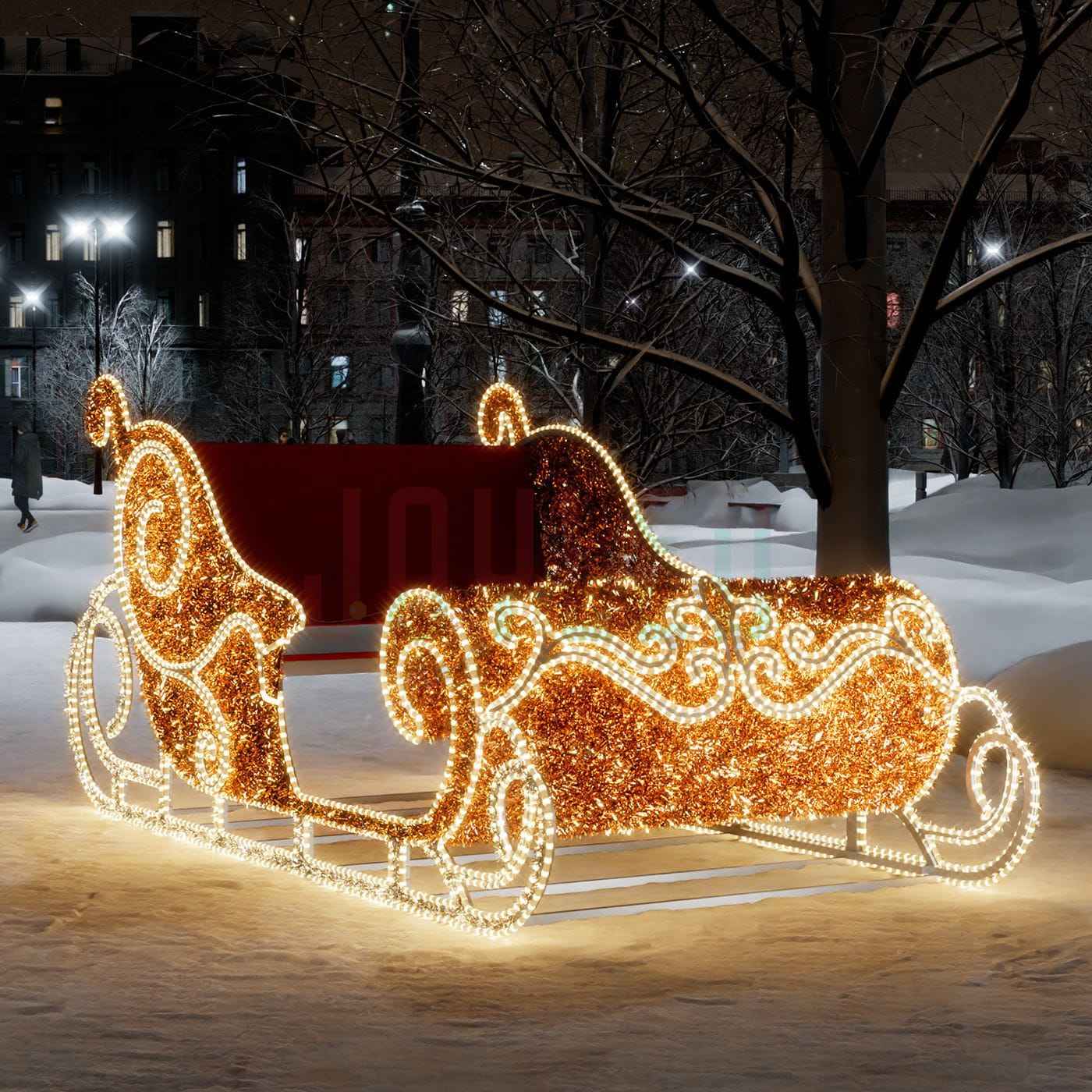 Уличная фотозона из мишуры «Золотые сани Деда Мороза»
