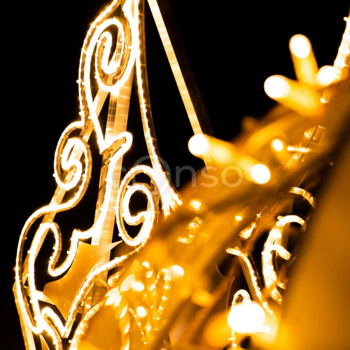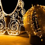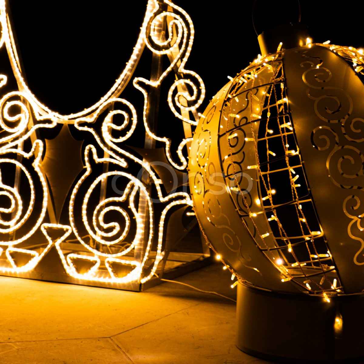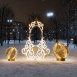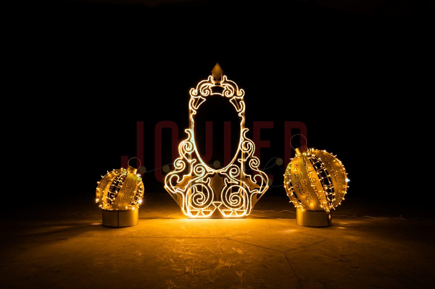 Конструкция включает зеркальную арку и два световых шара разного размера. Благодаря золотому свечению фигуры создают ощущение тепла и уюта даже в морозные зимние вечера. Этот объект органично вписывается в любую локацию — от центральной площади города до входной группы торгового центра.