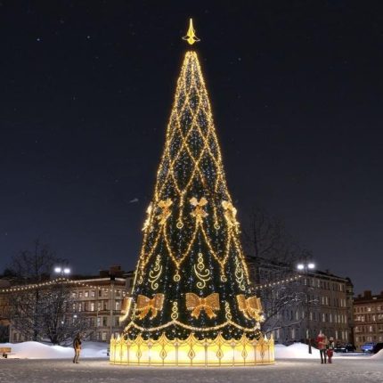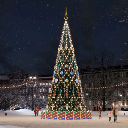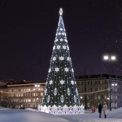 «Сибирская» — это символ зимнего величия и основной акцент любого праздничного пространства. Её высота может достигать 30 метров, что делает композицию видимой с любой точки площади. Эту модель выбирают, когда нужно подчеркнуть масштаб события и создать атмосферу торжества.