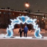 Холодное сияние подчёркивает зимний характер оформления и создаёт ощущение хрустального блеска. Благодаря эффектному дизайну арка становится не только украшением, но и фотозоной, привлекающей внимание жителей и гостей.