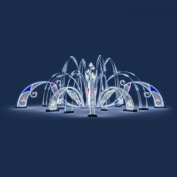 Фонтан «Калейдоскоп» — это уличная световая инсталляция, которая превращает любую локацию в место притяжения. Его впечатляющие размеры (почти 9 метров в ширину) и элегантная геометрия создают ощущение движения, ритма и лёгкости. Конструкция имитирует струи воды, но вместо настоящих брызг — холодное белое сияние, которое завораживает с первого взгляда.