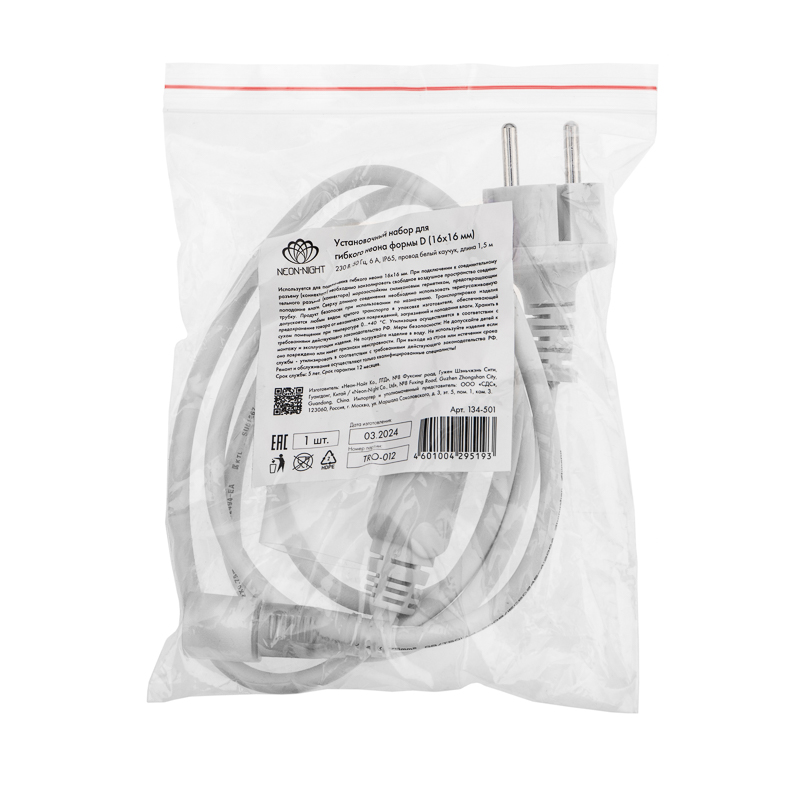 Установочный набор для гибкого неона 16×16 мм формы D (блок питания каучук с диодным мостом и вилкой, заглушка, переходная муфта, игла), 1,5м