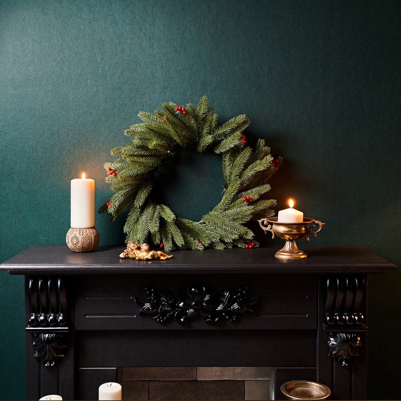 Этот литой еловый венок с декоративными ягодами — украшение, которое создаёт настроение с первого взгляда. Диаметр 45 см делает его заметным, но не перегруженным: он одинаково хорошо смотрится на входной двери, стене, камине, зеркале или в составе праздничной композиции.