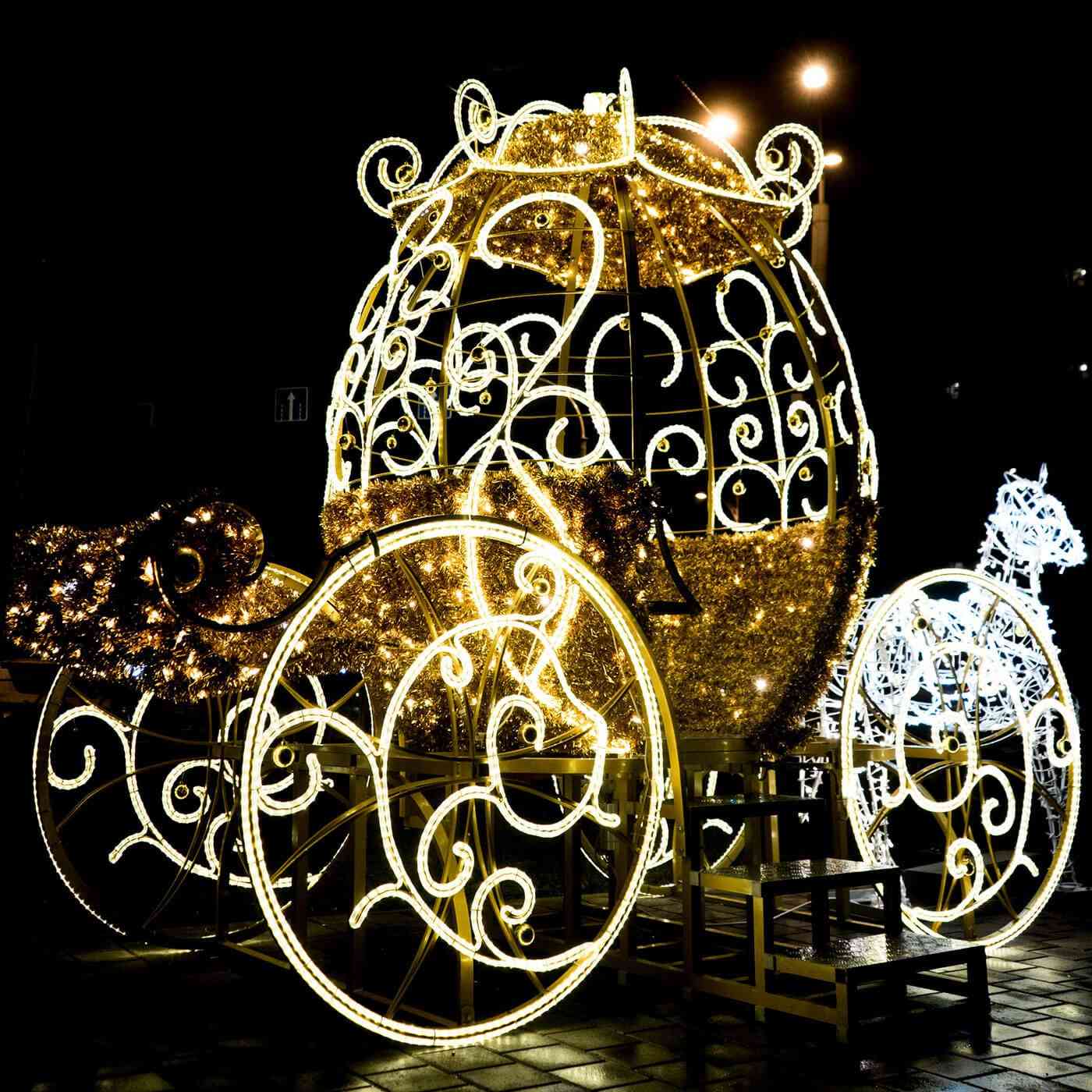Такие световые фигуры особенно популярны в период новогодних праздников. Они помогают создавать атмосферу чуда, украшают общественные пространства, становятся частью фотозон и праздничных маршрутов. Карета вызывает ассоциации с волшебными сказками, превращениями, балами и ёлками — именно тем, чего так не хватает в повседневной городской суете.