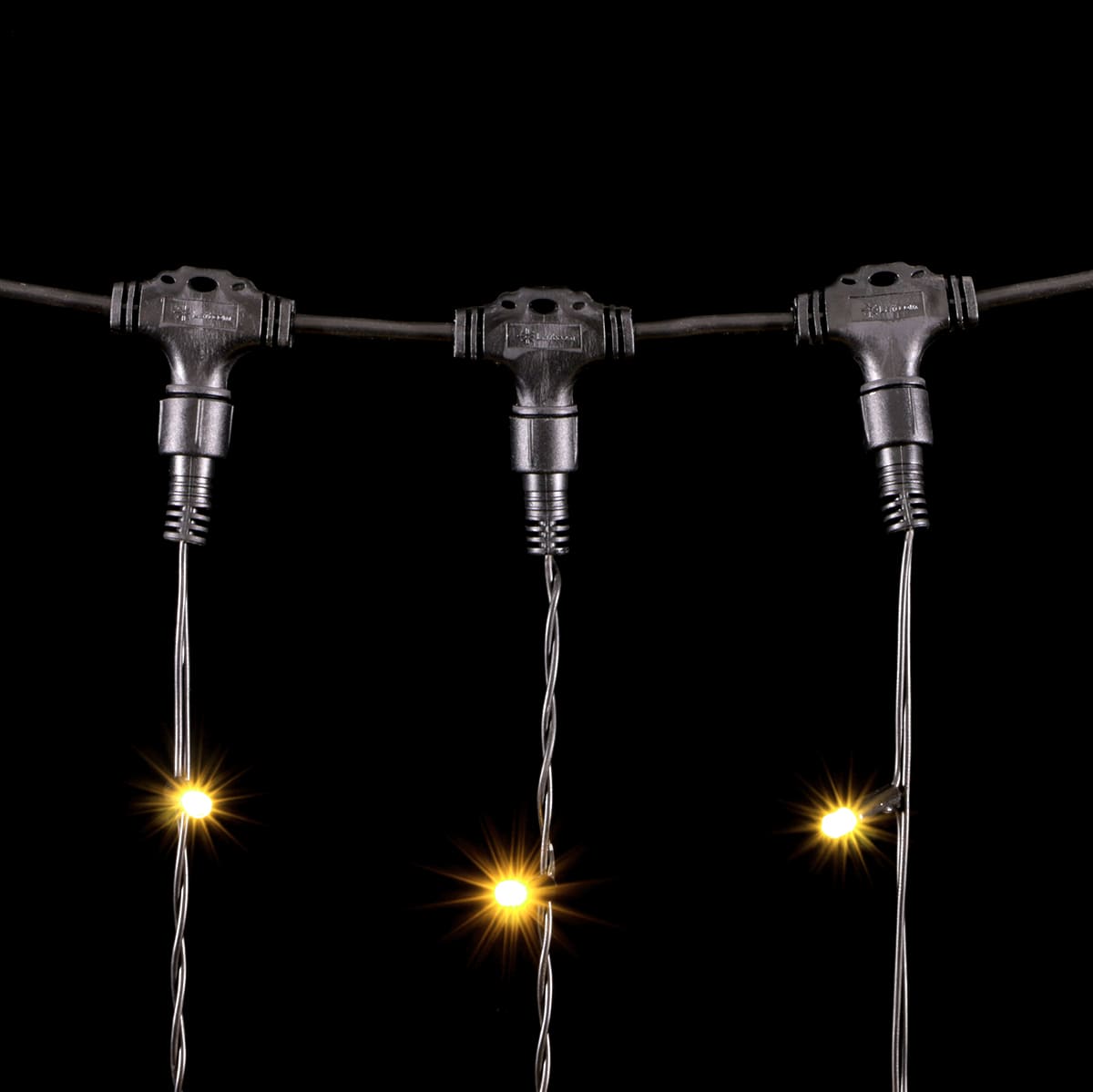 Колпачки на каждом светодиоде делают свечение мягким и элегантным, создавая эффект настоящих световых капель. Чёрный кабель идеально подходит для тёмных фасадов и конструкций, оставаясь практически незаметным днём.