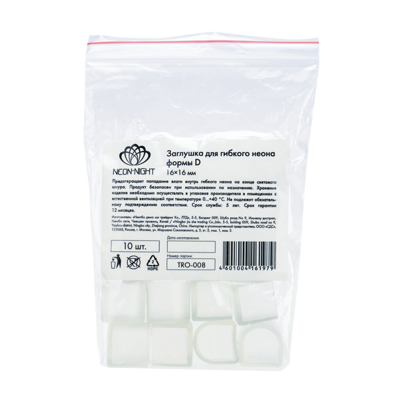 Заглушка выполнена из износостойкого прозрачного пластика, рассчитанного на работу при температурах от −15 до +40 °C. Конструкция формы D точно повторяет профиль неона 16×16 мм, что обеспечивает плотную посадку и исключает люфт.