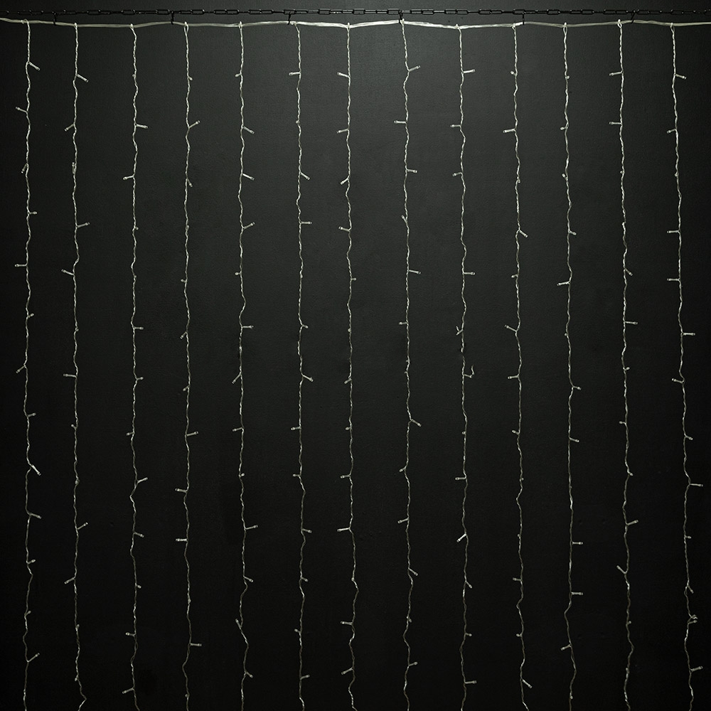 Эта модель занавеса создана специально для применения внутри помещений. Прозрачный провод делает конструкцию практически незаметной, а плотность свечения создаёт равномерный световой фон.